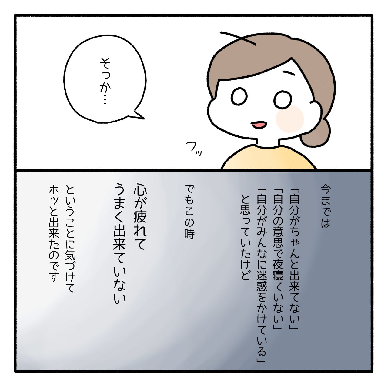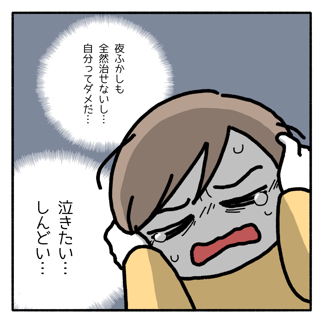 夜遅くまで起きてるので朝は疲れ切っていて、家のことは最低限しかできず、その状況に自分で自己嫌悪していたら…という感じでした