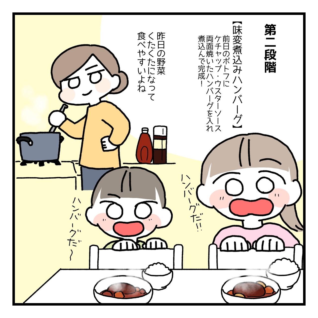 うちはポトフはコンソメのみで味付けしています。そして2日目のハンバーグは多めに作って、3日目にはそのハンバーグを潰します。