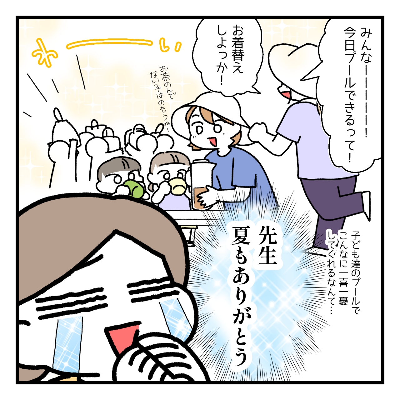 今はプールの期間が終わっているんですが、その分外遊びが増え、蚊が出てきているので対策してくれたり創作の秋なのか子ども達の創作に付き合ってくれて、子どもに寄り添って一喜一憂してくれて…